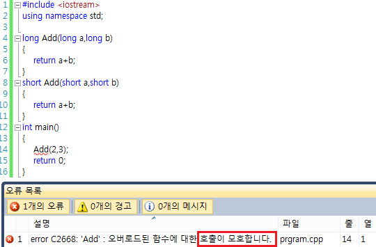 C++ 컴파일러는 이럴 때 컴파일 오류 메시지로 “호출이 모호합니다.”라는 메시지를 출력합니다.