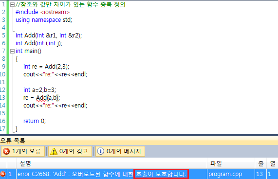 마지막으로 함수 중복 정의할 때 입력 매개 변수가 참조와 값만 차이가 있으면 호출할 때 변수를 전달했을 때 어느 것을 호출하는지 모호해서 참조 입력 매개 변수로 정의한 함수를 부를 수가 없습니다. 따라서 함수 중복 정의할 때는 참조와 값만 차이가 있게 작성하지 마세요.