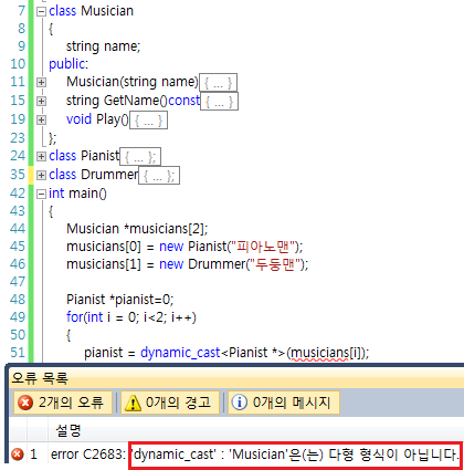 pianist = dynamic_cast<Pianist *>(musicians[i]);//가상 메서드가 없어서 컴파일 오류