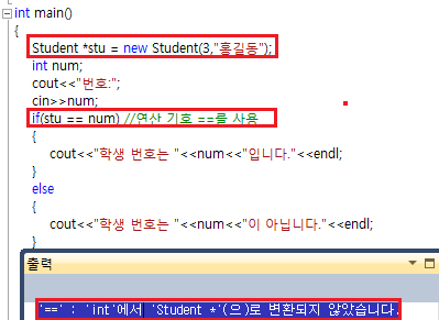 그런데 이처럼 정의하면 stu==num 과 같은 표현은 문법에 맞는 표현이지만 num == stu는 문법에 맞지 않는 표현입니다. 사용하는 개발자는 == 연산자는 교환 법칙이 성립할 것이라고 생각하여 num == stu 구문을 사용하면 문법적 오류가 발생합니다. 제공하는 개발자는 이러한 문법적 오류가 발생하지 않게 사용하는 개발자의 관점에서 편의성을 제공해야 합니다.