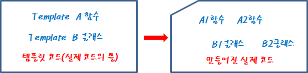 C++언어에서 템플릿은 실제 코드를 만들기 위한 가짜 코드를 말합니다. 템플릿으로 형식이나 기능을 정의해도 실제 컴파일한 기계어 코드에는 반영하지 않습니다. 대신 템플릿으로 정의한 것을 사용하는 부분이 있으면 컴파일러는 사용하는 것에 맞게 실제 코드를 만들어 기계어 코드에 반영합니다. 따라서 사용하는 부분에 따라 하나의 템플릿 코드는 여러 개의 실제 코드로 기계어에 반영할 수 있습니다.