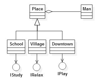 장소는 학생이 아닌 학생의 기반 형식인 사람을 보관하고 있어야 합니다. 학생을 보관하게 하는 것은 요구 조건에 약속한 행위 외에 다른 행위를 명령할 수 없다는 조건을 위배합니다. 그리고 학교는 IStudy, 주거지는 IRelax, 다운타운은 IPlay 형식에 명령을 내릴 수 있으니 직접 연관 관계로 표시합니다.