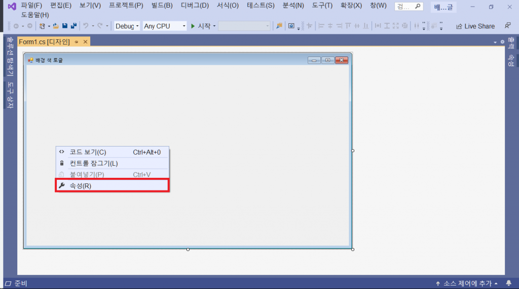첫 번째 실습은 Form 배경색을 Toggle하는 응용입니다.