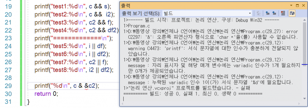 컴파일하면 아무런 오류가 없는 것을 보면 역시 논리연산에는 수를 표현할 수 있는 다양한 형식이 올 수 있다는 것을 알 수 있어요.