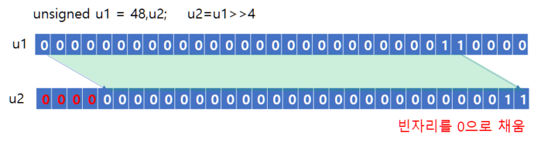 참고로 부호 없는 정수의 오른쪽 쉬프트 연산은 논리 쉬프트 연산입니다. (왼쪽 쉬프트와 같습니다.)