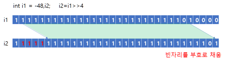 부호 있는 정수의 오른쪽 쉬프트 연산은 산술 쉬프트 연산입니다.