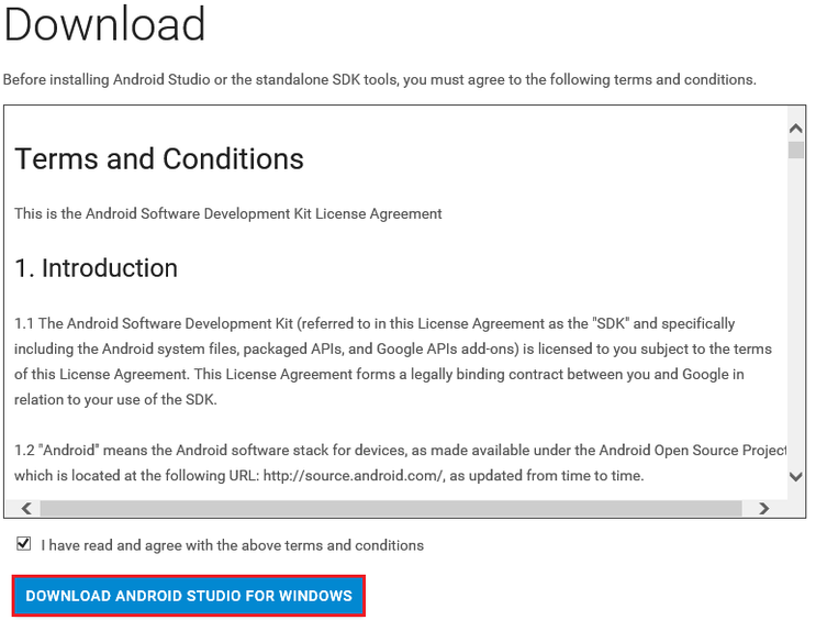 동의 후에 DOWNLOAD ANDROID STUDIO FOR WINDOWS 버튼을 클릭하세요.