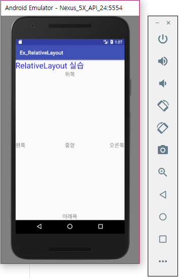 이번에는 자식 컨트롤을 배치할 때 상, 하, 좌, 우, 중앙 등을 선택하여 배치할 수 있는 RelativeLayout을 이용하는 간단한 실습을 해 봅시다.