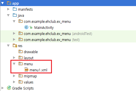 app>>res 하위에 menu 폴더를 생성한 후에 두 개의 메뉴 파일(menu1.xml, menu2.xml)을 추가하세요.