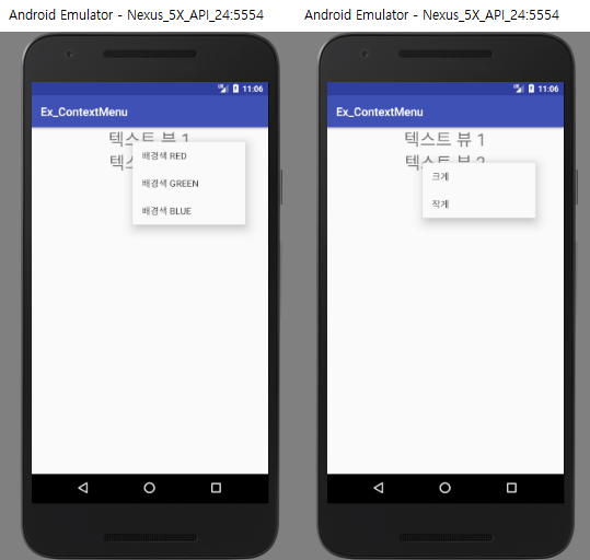 이번 실습에서는 두 개의 TextView를 배치하고 각각의 TextView 개체마다 서로 다른 Context Menu를 띄우는 실습을 할 거예요.