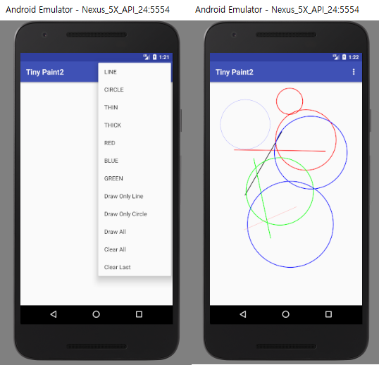 사용자는 메뉴에서 그릴 도형을 선택(선, 원)할 수 있고 펜의 두께(얇게, 두껍게)를 선택하거나 색상(빨강, 파랑, 녹색)을 선택할 수 있습니다. 그리고 선만 그리게 하거나 원만 그리거나 전체를 그리는 것을 선택할 수 있고 전체 도형을 지우거나 가장 최근에 그린 도형을 지울 수 있습니다.