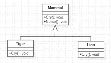 호랑이와 사자는 포유류를 기반으로 파생 형식으로 정의합니다. 그리고 기반 형식에 추상 메서드로 정의한 Cry를 반드시 재정의해 주어야 합니다.
