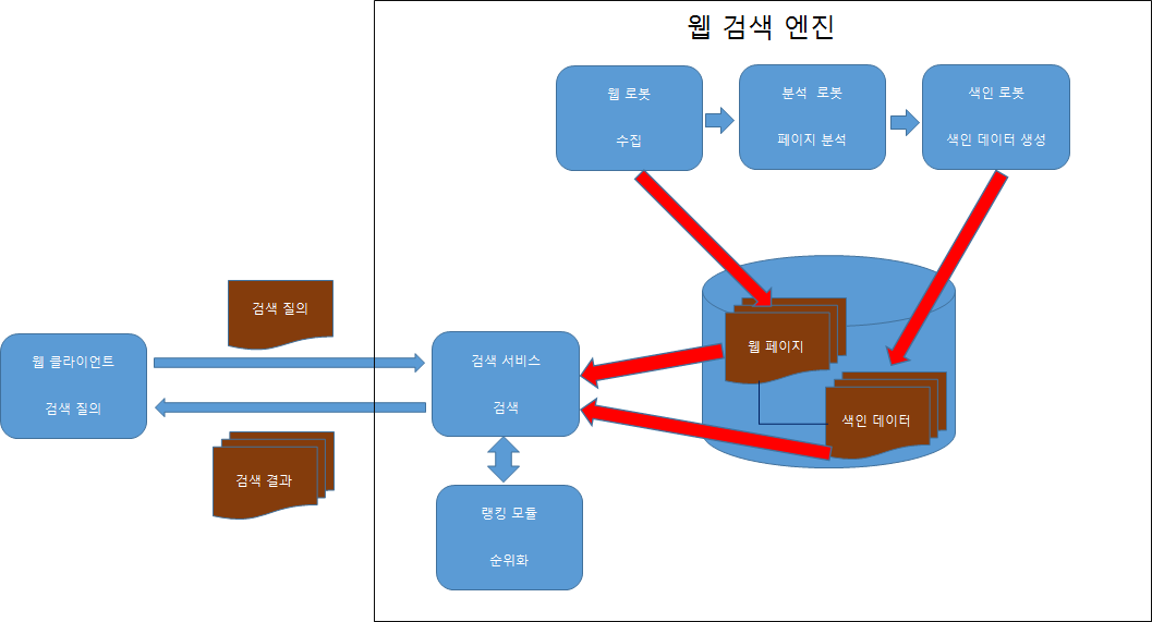 웹 검색 엔진의 구성을 살펴보면 게시한 웹 페이지를 수집하는 웹 로봇과 수집한 웹 페이지 내용을 분석하는 분석 로봇, 분석한 결과를 색인하는 색인 로봇, 검색 요청을 받아 색인 자료를 통해 검색 결과를 얻어오는 검색 엔진으로 구성합니다. 그리고 검색 결과를 순위화하는 랭킹 모듈 등을 추가로 구성하여 품질 수준을 높일 수 있습니다.