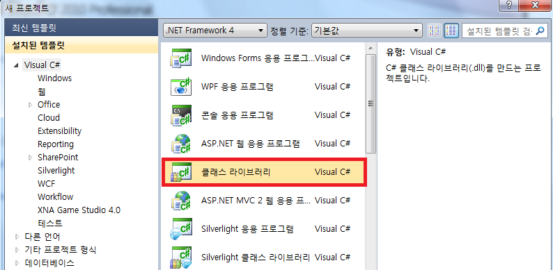 Microsof Visual Studio로 라이브러리를 만들 때는 다음과 같이 새 프로젝트 템플릿에서 클래스 라이브러리를 선택하여 만들면 됩니다.