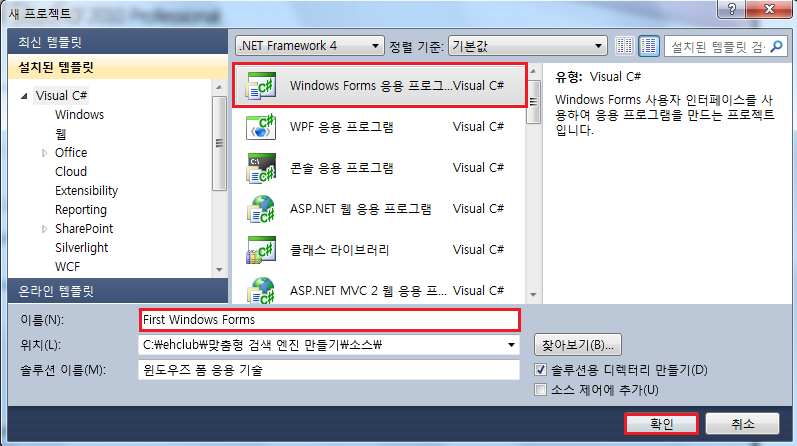 이번에는 간단하게 Windows Form 응용 프로그램을 만들기 위해 필요한 기술을 알아봅시다. 먼저 윈도우즈 응용 프로그램을 만들기 위해 Windows Forms 응용 프로그램 템플릿을 선택합니다.