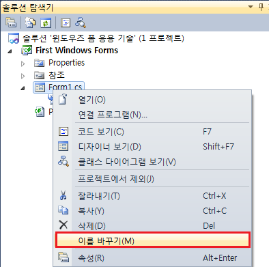 Windows Form 프로젝트를 생성할 때 만들어진 메인 폼의 이름이 Form1인데 이를 자신이 원하는 이름으로 변경하세요.