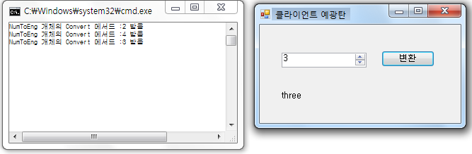 시연 화면을 보면 알 수 있듯이 서버 측의 원격 개체의 Convert 메서드가 동작함을 알 수 있습니다.