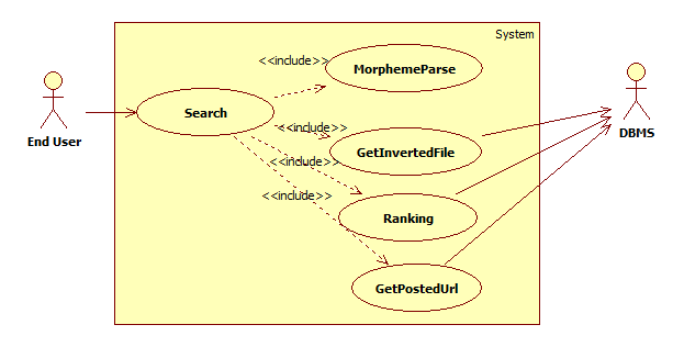 먼저 최종 사용자와 상호 작용에 관한 유즈케이스 다이어그램을 작성합시다. 최종 사용자는 검색할 때만 EH WSE와 상호 작용합니다. 검색 요청하면 내부 시스템에서는 검색 질의를 형태소로 분리하는 작업을 수행합니다(MorphemeParse). 그리고 색인 데이터에서 질의 요소를 포함하는 웹 페이지 정보를 얻어옵니다(GetInvertedFile). 검색 정보를 순위화하고(Ranking) 수집한 페이지의 정보를 보여줍니다(GetPostedUrl).