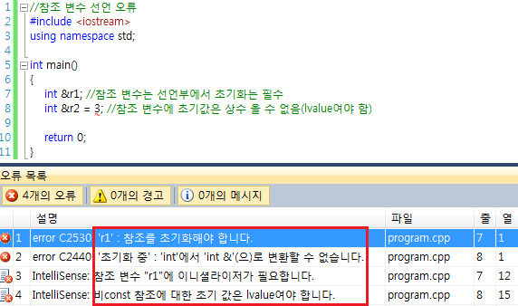 이러한 이유로 레퍼런스 변수는 선언과 함께 초기화를 해 주어야 합니다. 그리고 반드시 초기화에 사용하는 우항은 l-value(대입 연산자의 좌항에 올 수 있는 표현)여야 합니다. 참조 변수 선언문에 초기화를 하지 않거나 상수로 초기값을 설정하면 컴파일 오류가 발생해요.