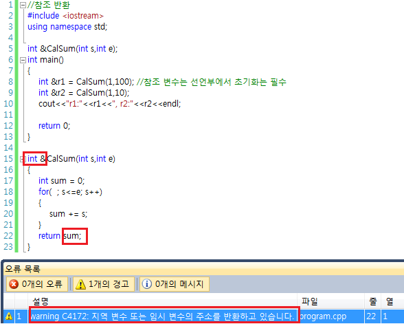 다음의 코드는 s에서 e 사이에 정수의 합계를 구하는 함수를 호출하여 사용한 예제 코드예요. 반환 형식은 int &로 정의하였고 지역 변수 sum을 반환하고 있어요. 컴파일은 가능하지만 경고 메시지가 나오고 실제 수행해 보면 버그가 있음을 알 수 있어요.