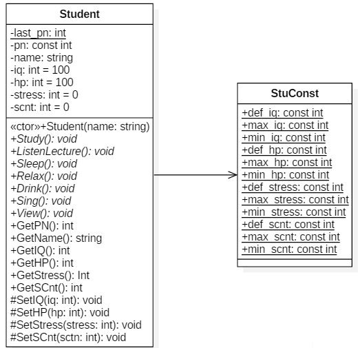 학생 클래스는 멤버 필드로 이름, 주민번호, 체력, 지력, 스트레스와 연속으로 공부한 횟수가 필요합니다.