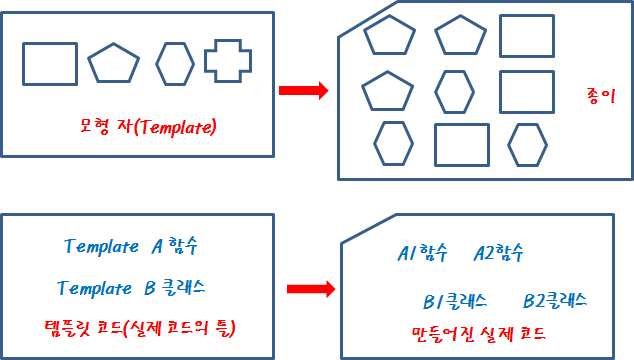 C++언어에서 템플릿은 실제 코드를 만들기 위한 가짜 코드를 말합니다. 템플릿으로 형식이나 기능을 정의해도 실제 컴파일한 기계어 코드에는 반영하지 않습니다. 대신 템플릿으로 정의한 것을 사용하는 부분이 있으면 컴파일러는 사용하는 것에 맞게 실제 코드를 만들어 기계어 코드에 반영합니다. 따라서 사용하는 부분에 따라 하나의 템플릿 코드는 여러 개의 실제 코드로 기계어에 반영할 수 있습니다.