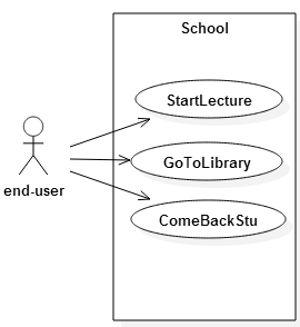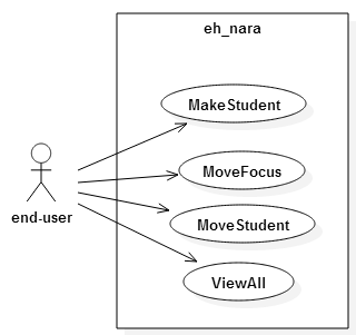 그리고 학교에서는 강의 시작, 도서관 가기, 이 에이치 나라로 학생 복귀하기할 수 있습니다. 초점 종료는 학교로 초점이 온 후에 수행하는 기능을 종료하여 원래 수행했던 이 에이치 나라의 상호 작용을 수행하는 것이므로 Usecase에 표현하지 않습니다.