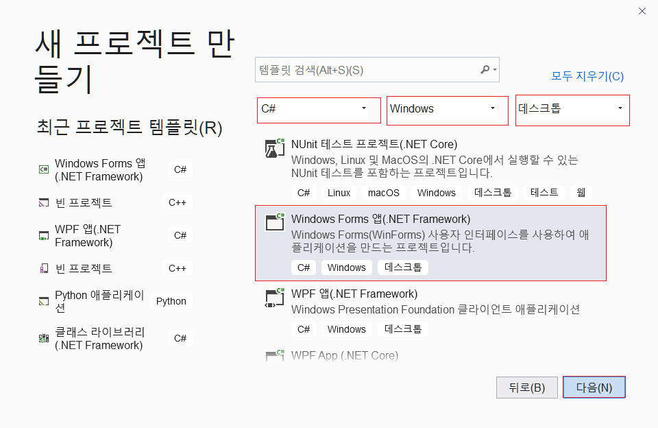 프로젝트 템플릿 유형 중에서 Windows Forms 앱(.NET Framework)를 선택하고 다음 버튼을 클릭합니다.