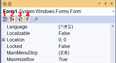 순서에 따라 항목 별 보기(1), 알파벳 순으로 보기(2), 속성(3), 이벤트(4) 입니다.