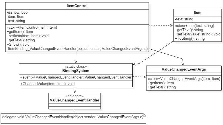 BindingSystem은 내부에 Item 개체 값이 바뀔 때 처리를 위한 이벤트를 멤버로 갖습니다. ItemControl은 BindingSystem에게 Item 개체 정보가 바뀔 때 처리할 이벤트 핸들러를 등록합니다.